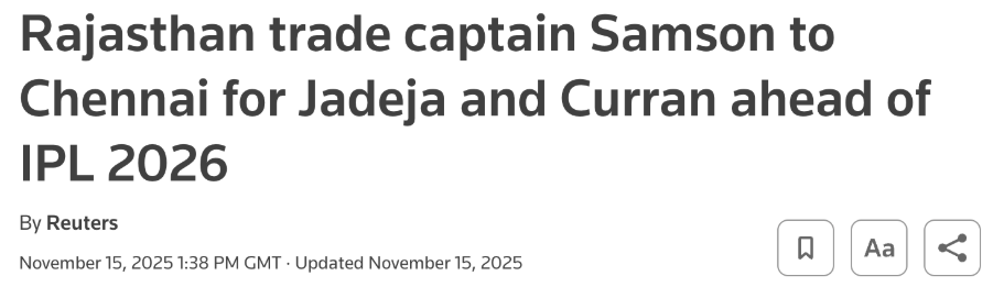 Prior to this, CSK had reportedly been looking to trade for Washington Sundar, to replace Jadeja – who, admittedly, is 36 years old, and retired from T20Is. That fell through, and all was quiet, until murmurings of this trade dropped. All of a sudden, Jadeja is returning home to Rajasthan, alongside Sam Curran – a fairly expendable piece for Chennai – while Samson, the Kerela-born wicketkeeper batter, moves closer to home himself.